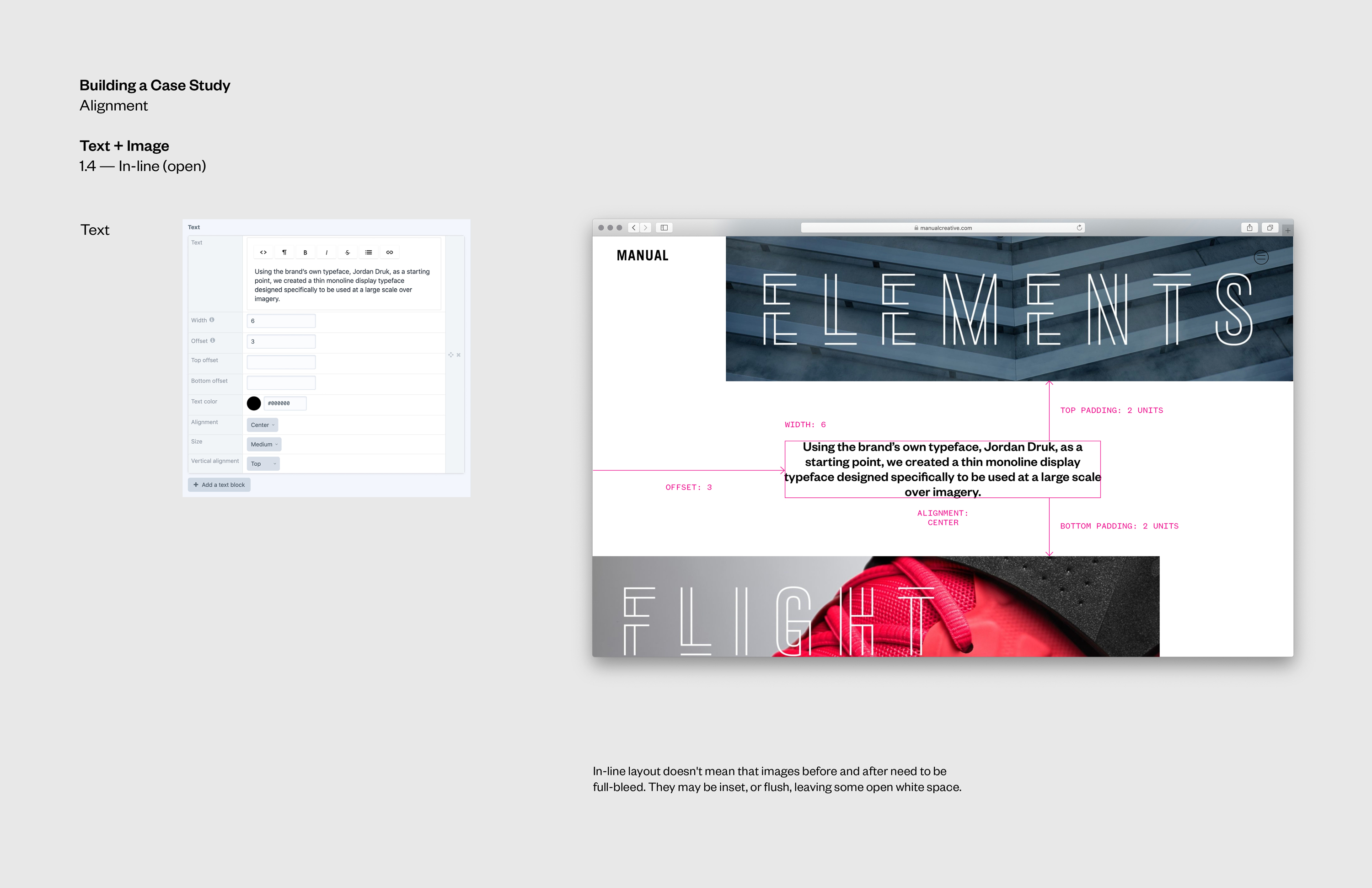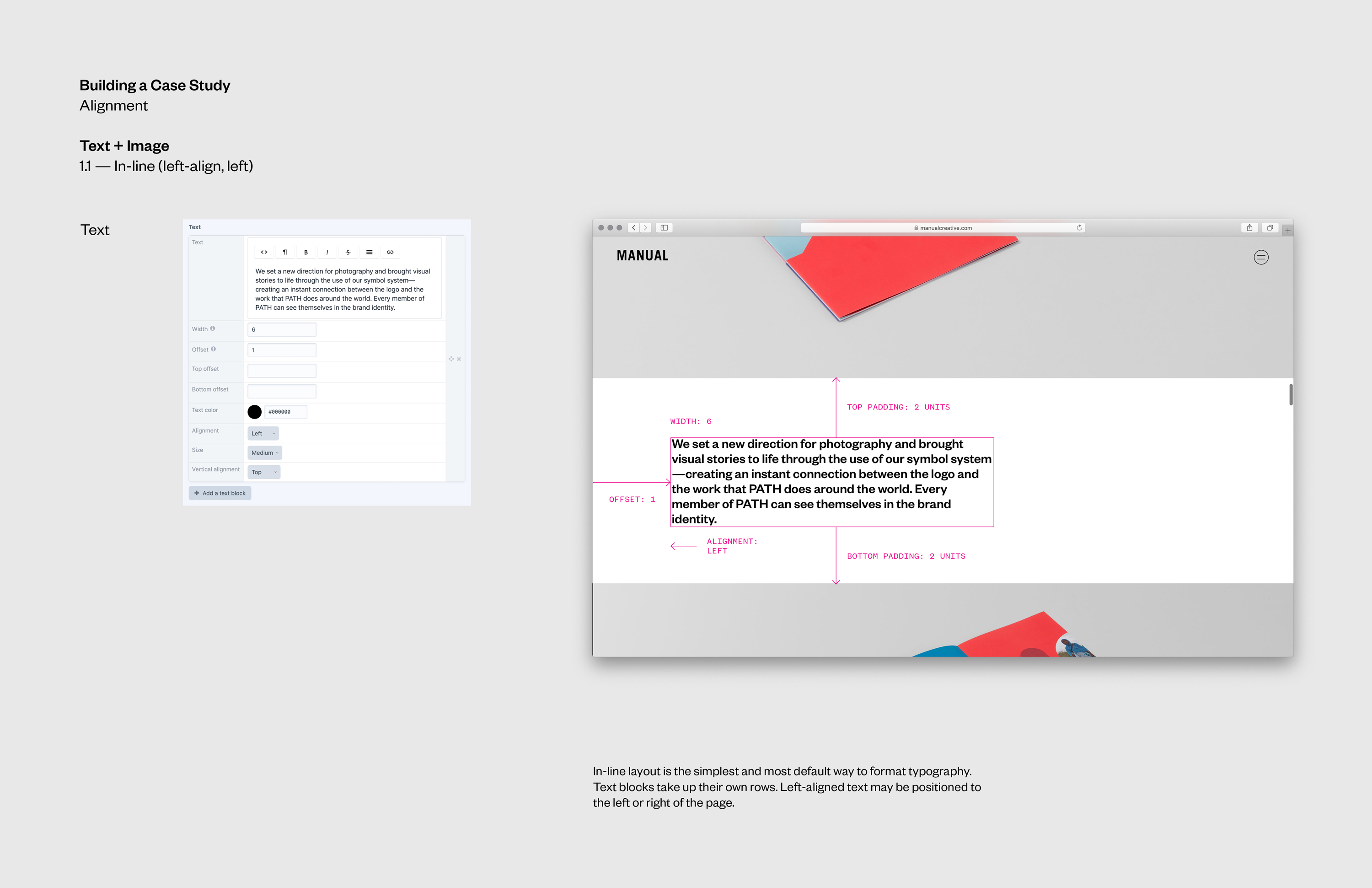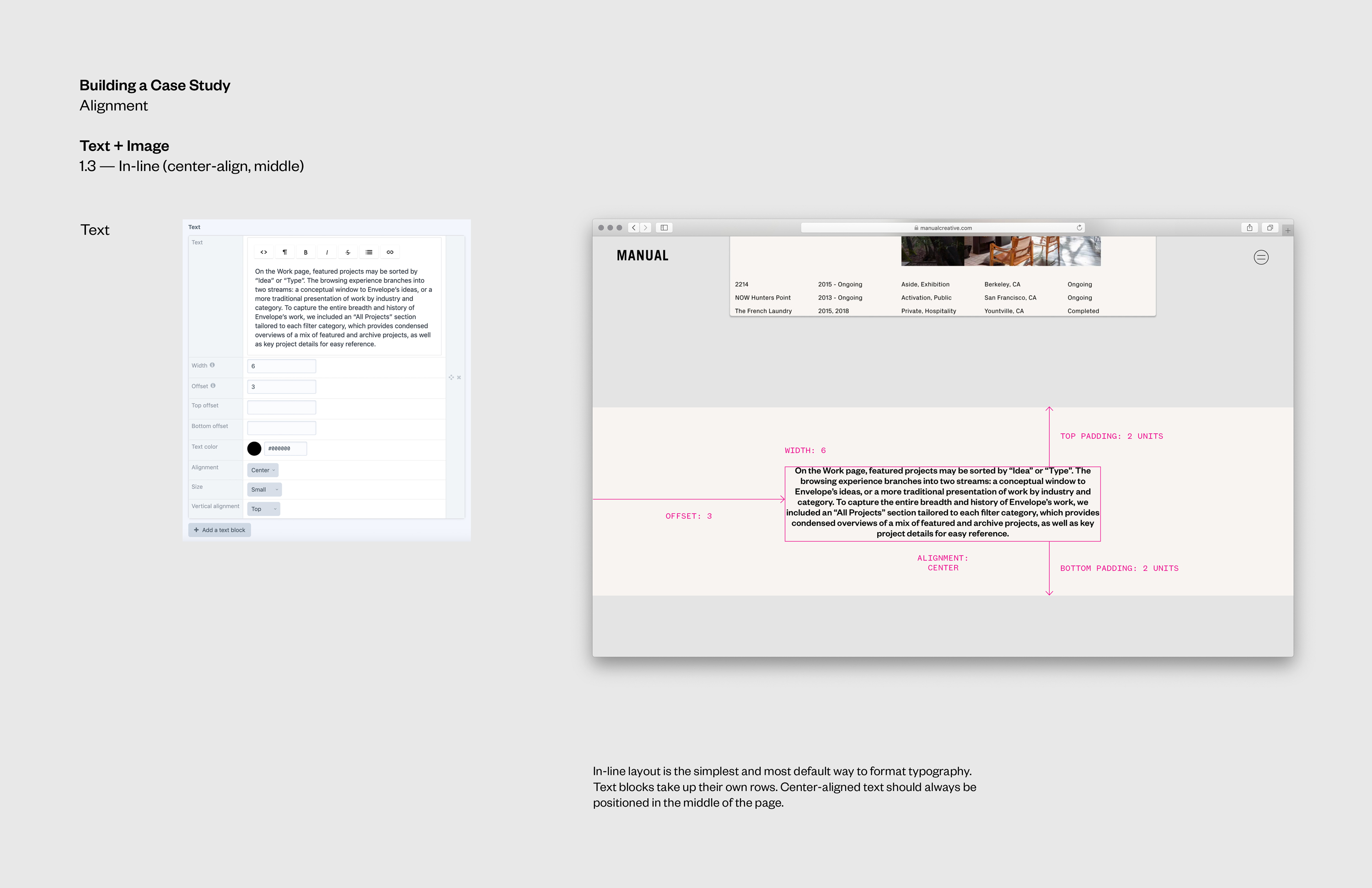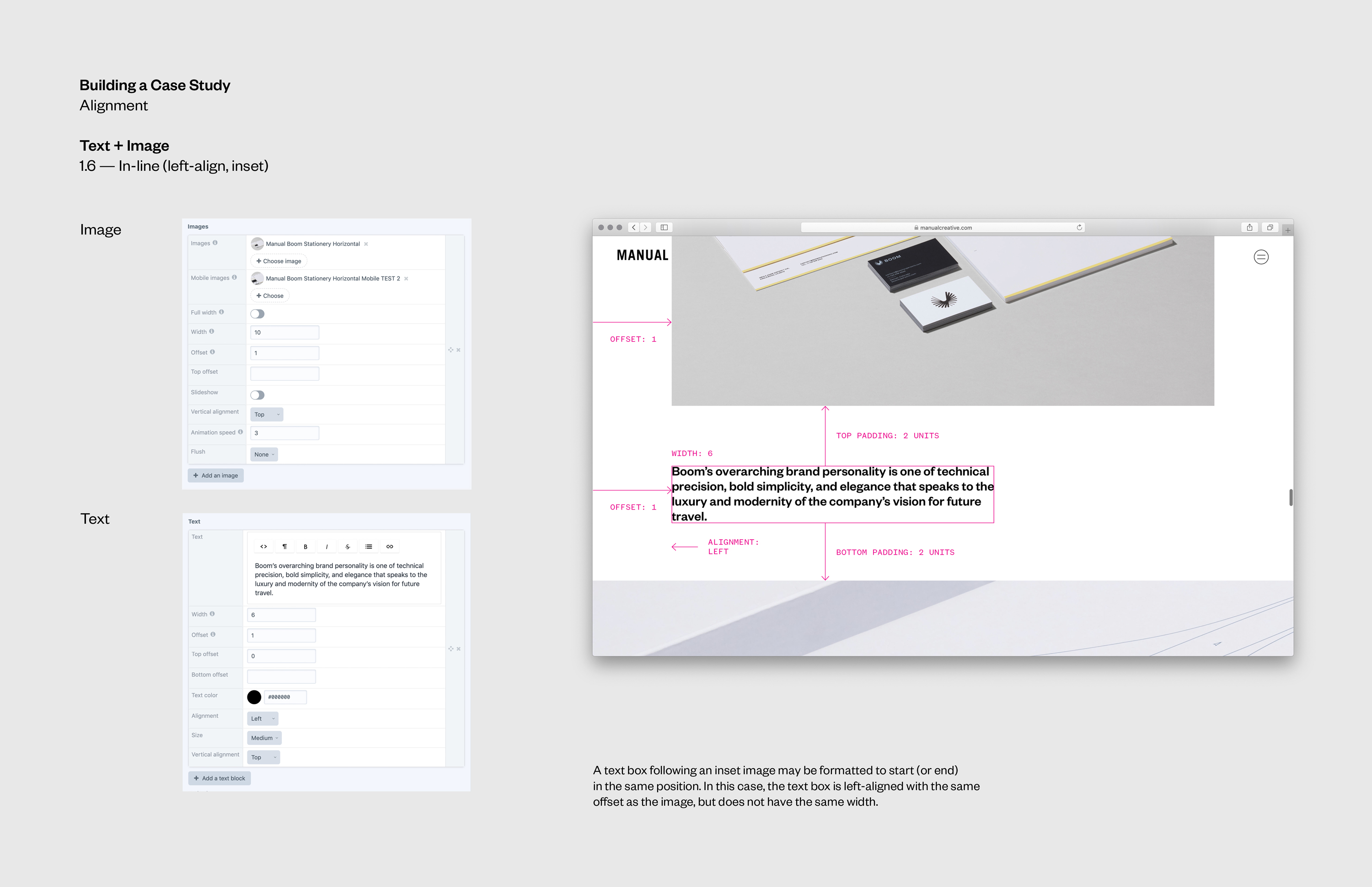 I created a 69-page usage guide to ensure the Manual team can continue building case studies and use the Craft system in my absence. This guide thoroughly documents fundamental aspects of the CMS, asset preparation guidelines, content functions, layout parameters, as well as page styling methods.