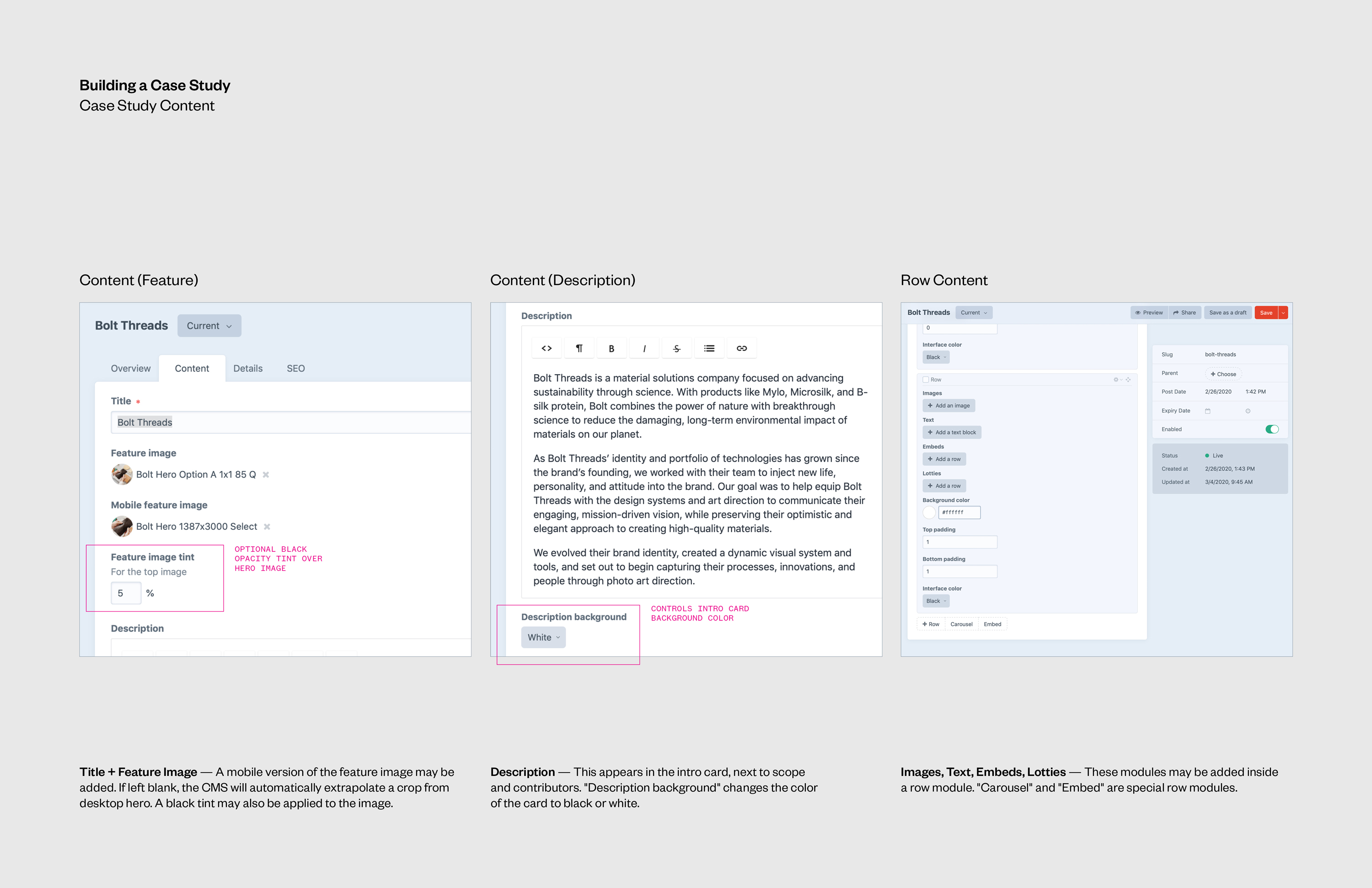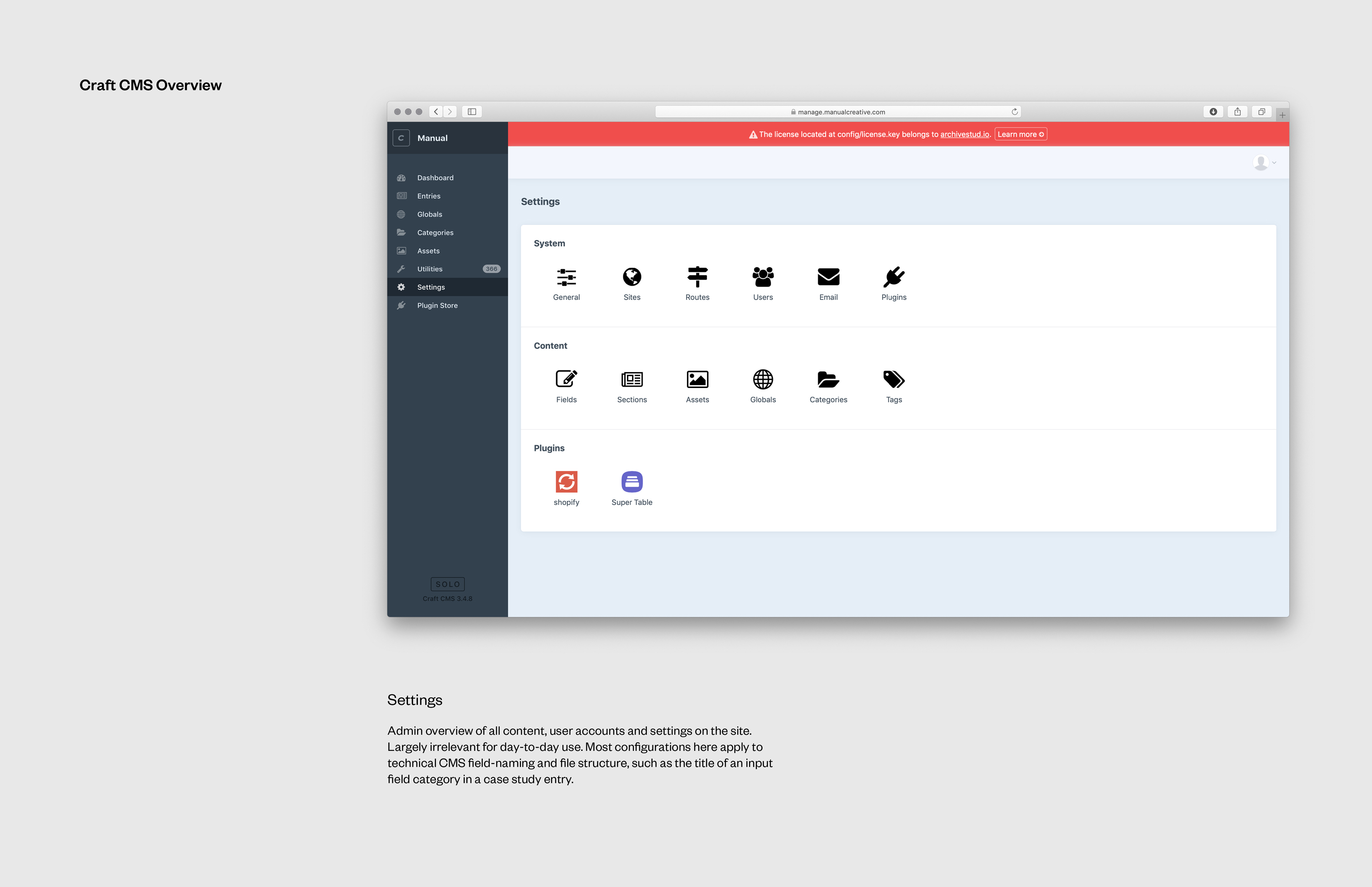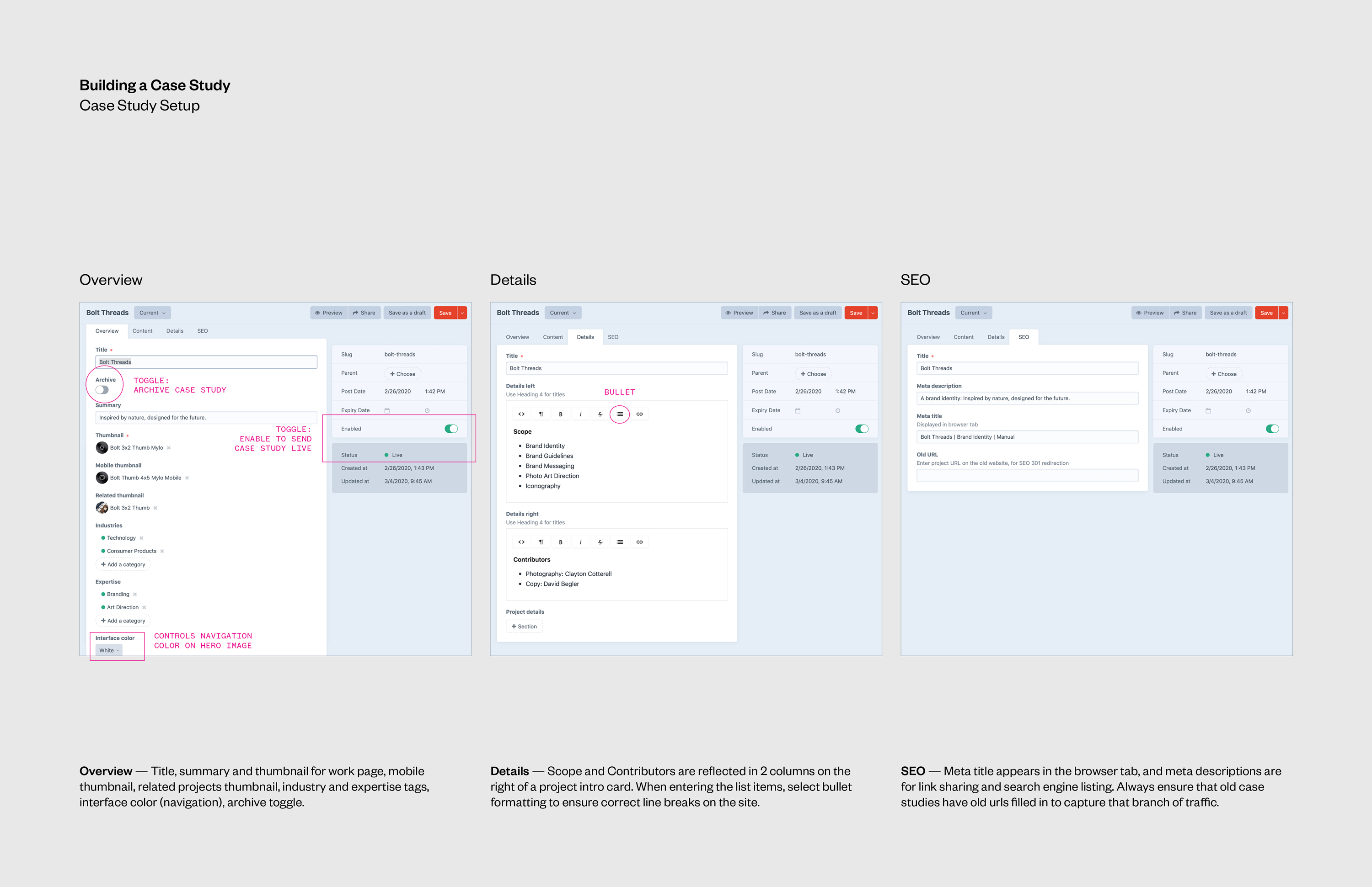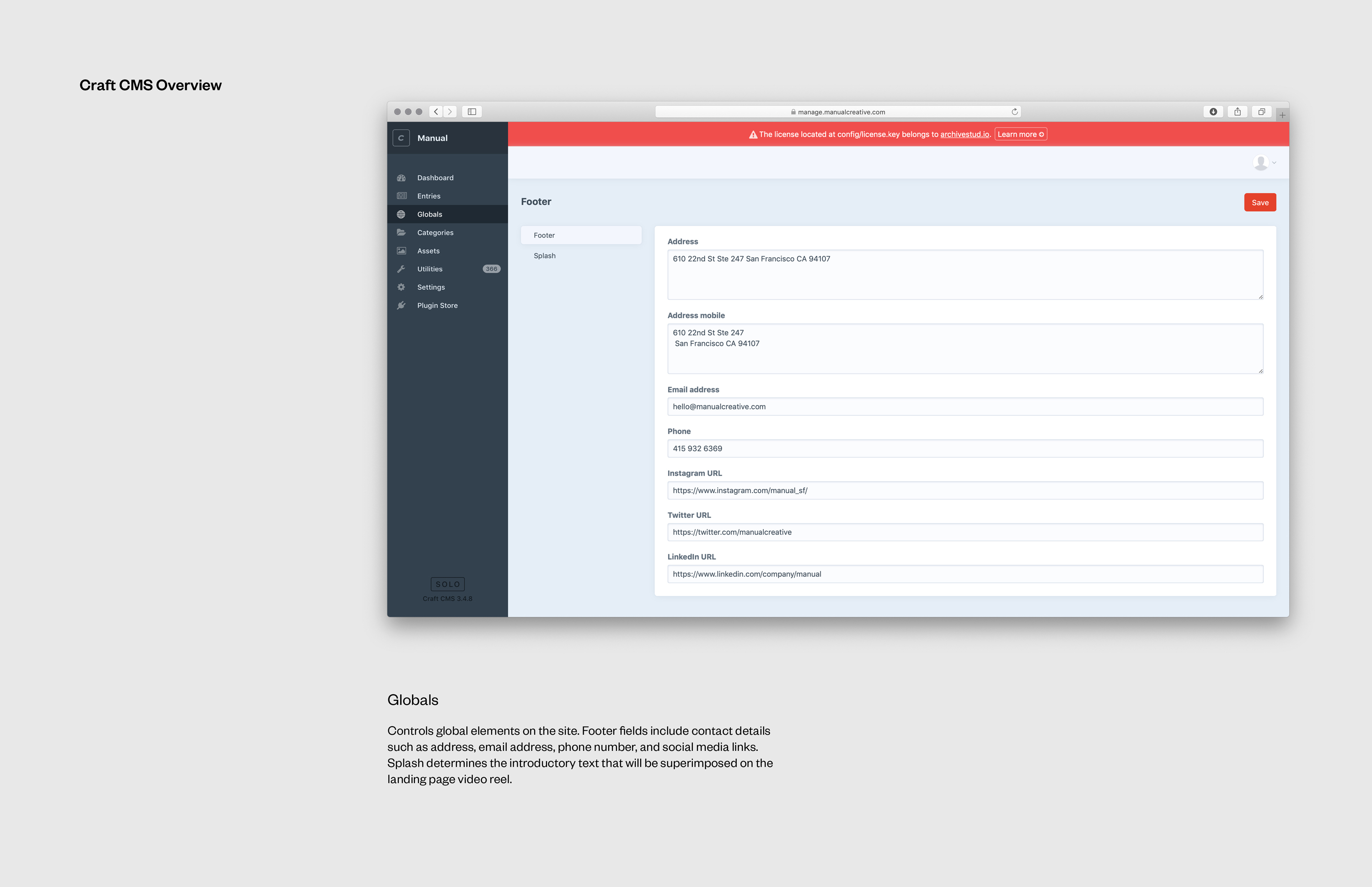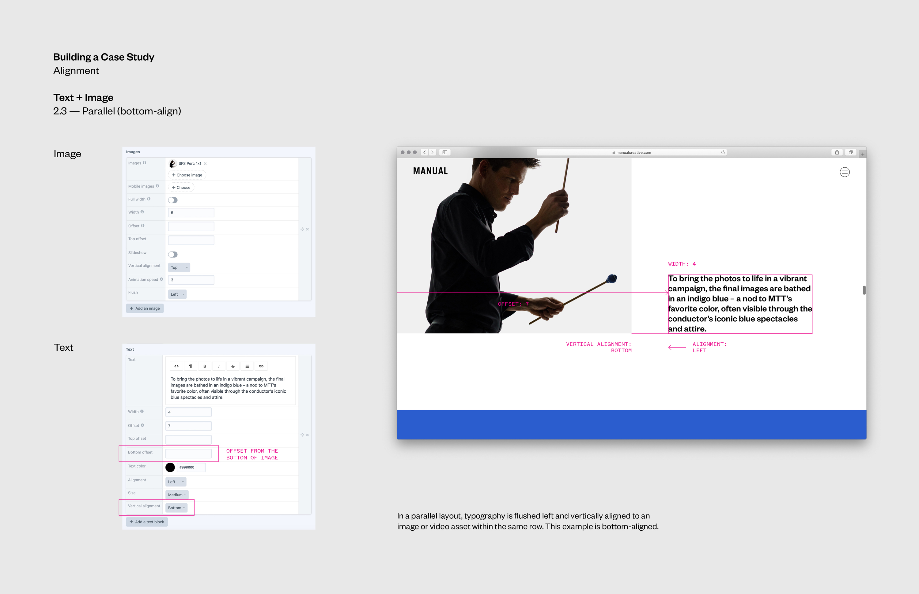 I created a 69-page usage guide to ensure the Manual team can continue building case studies and use the Craft system in my absence. This guide thoroughly documents fundamental aspects of the CMS, asset preparation guidelines, content functions, layout parameters, as well as page styling methods.