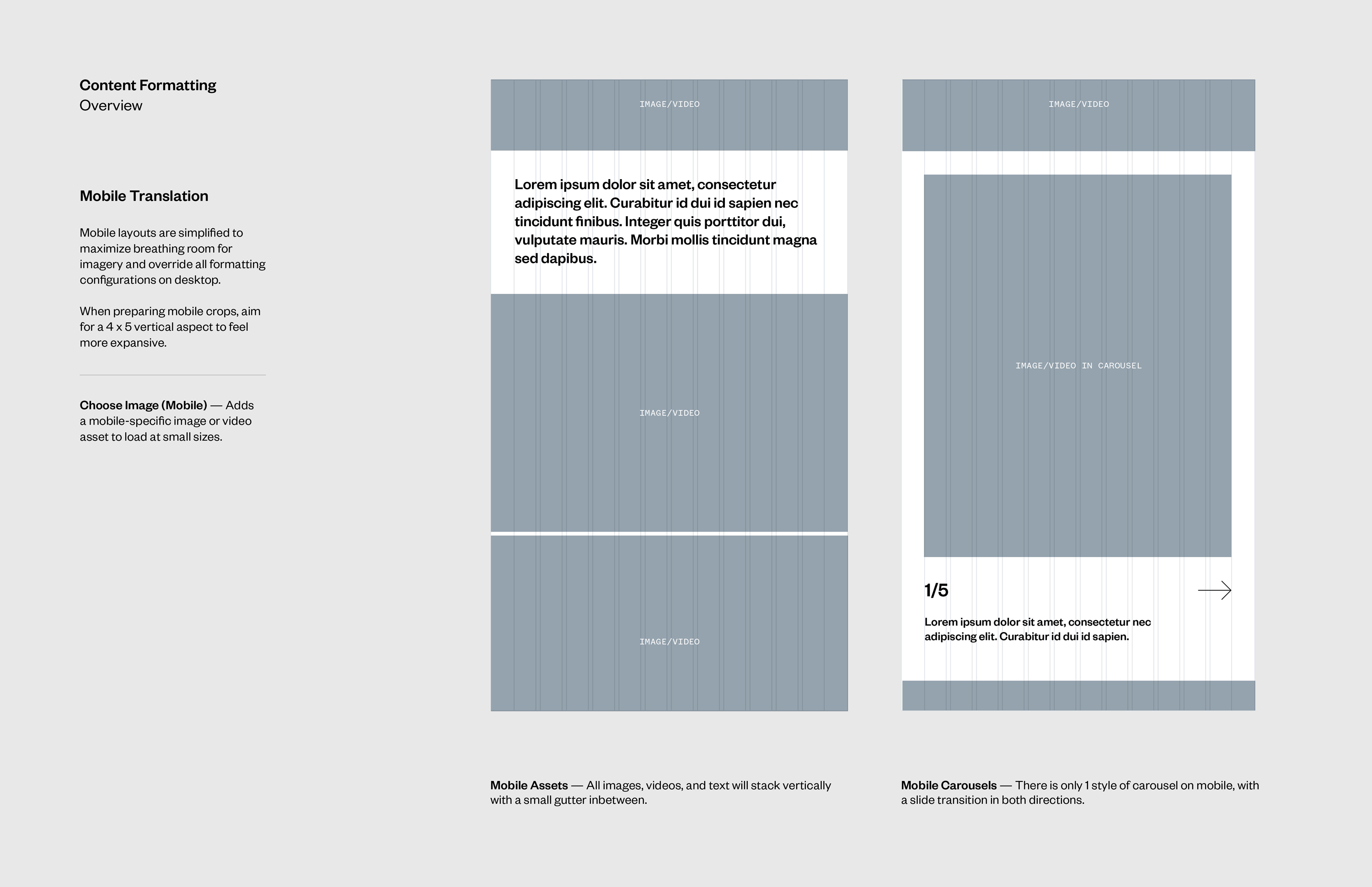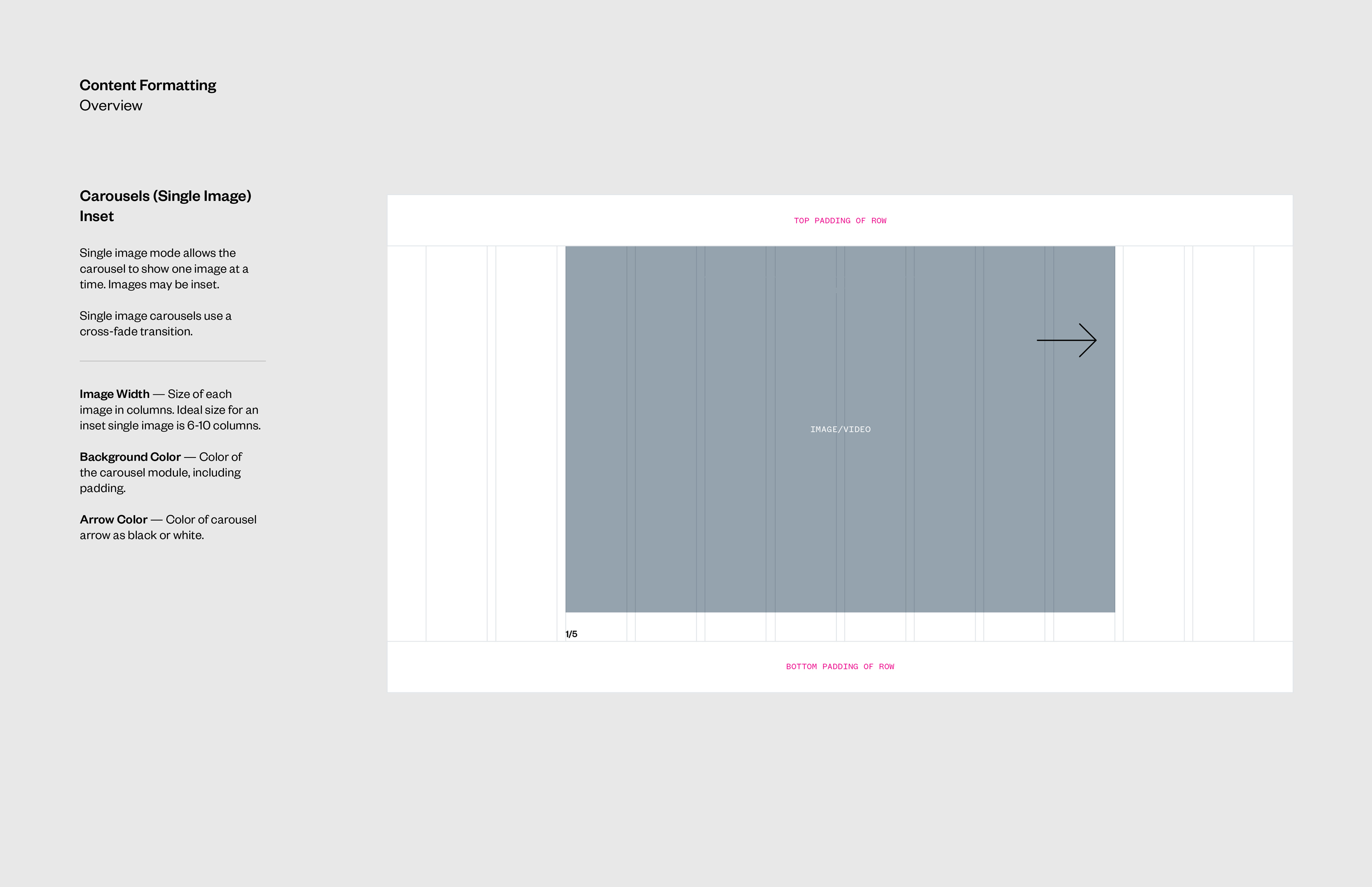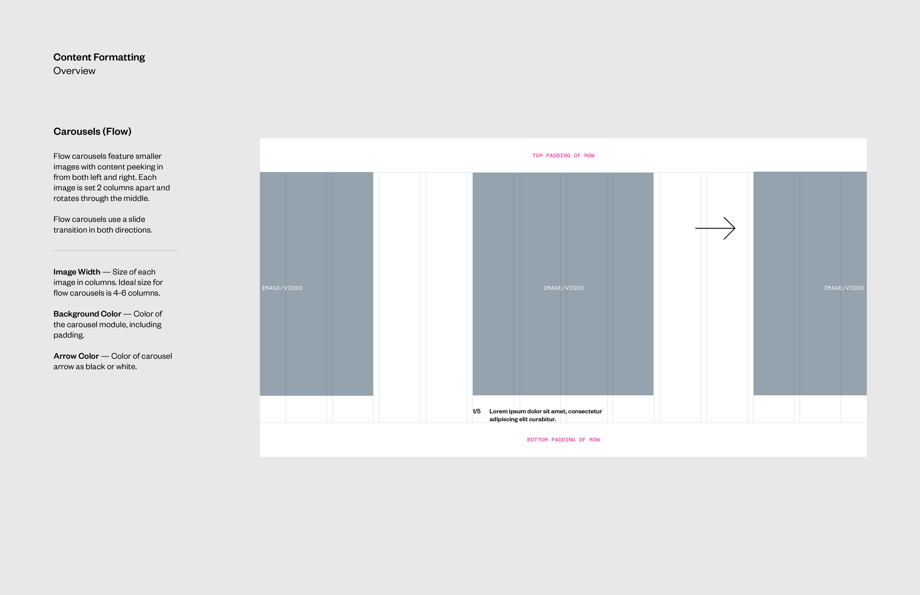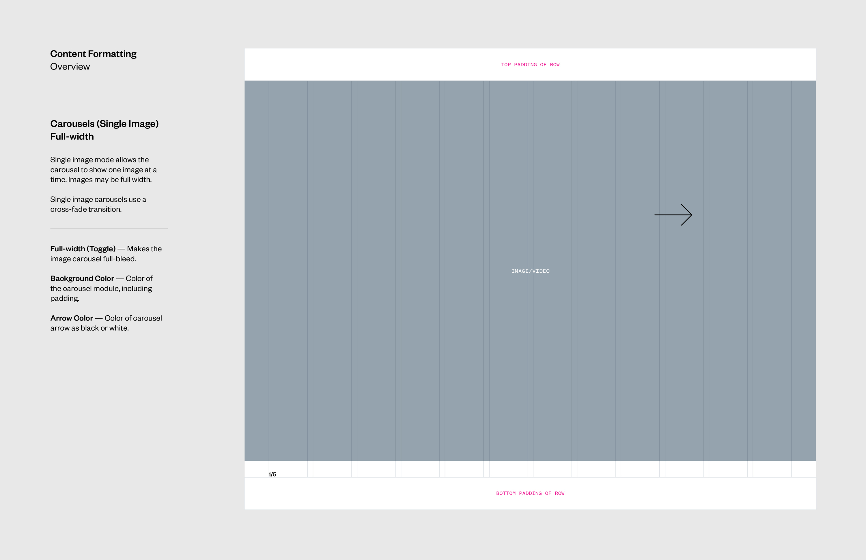 The new site allowed for lots of storytelling flexibility. Built on a grid offset system, we could control almost all aspects of the layout from the CMS by specifying the number of columns and padding units, which sizes and positions our assets accordingly. We also have the option to change the color of module backgrounds, typography, and even carousel styles from an inset “flow” sequence to cinematic full-bleed imagery.