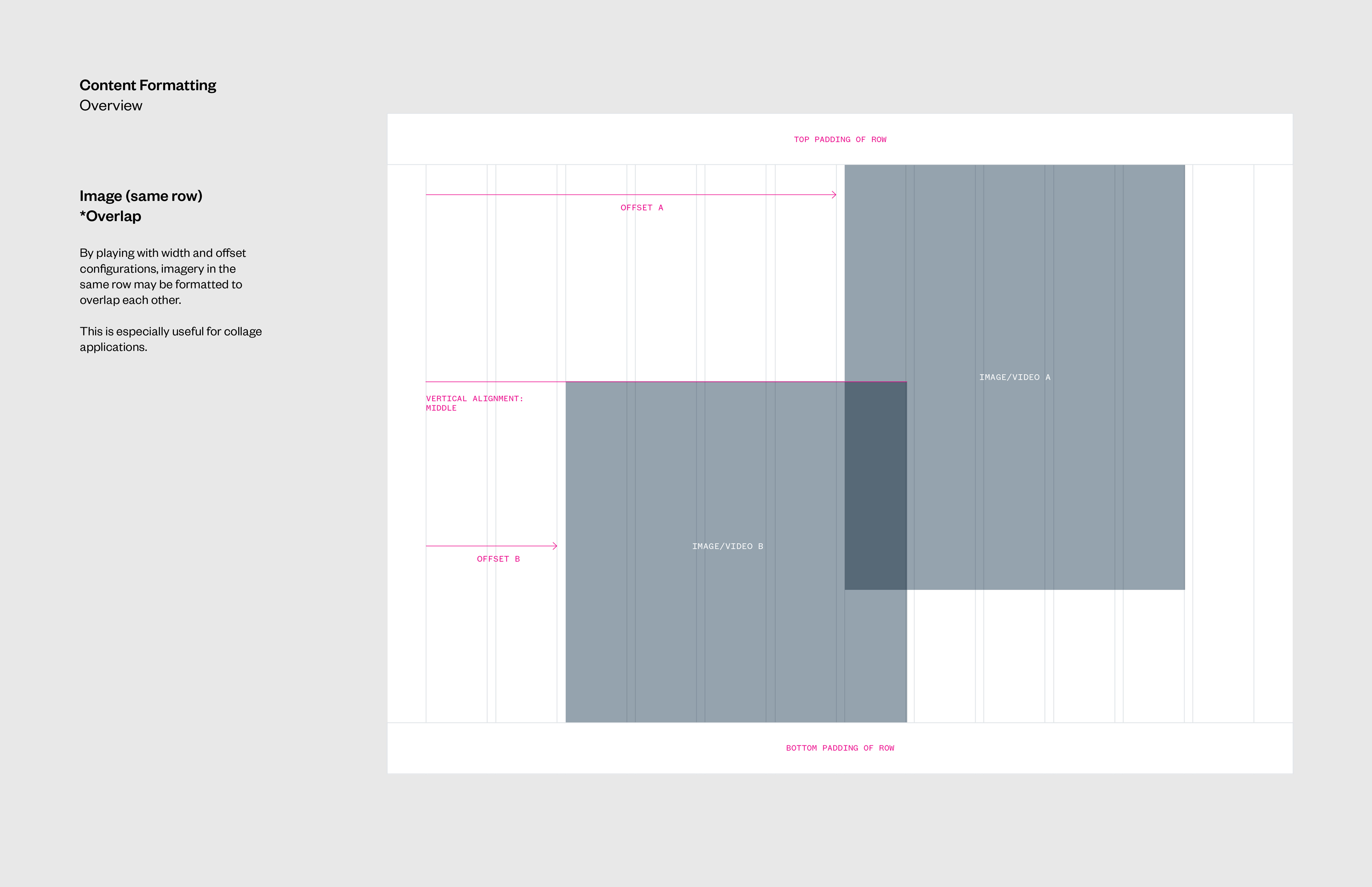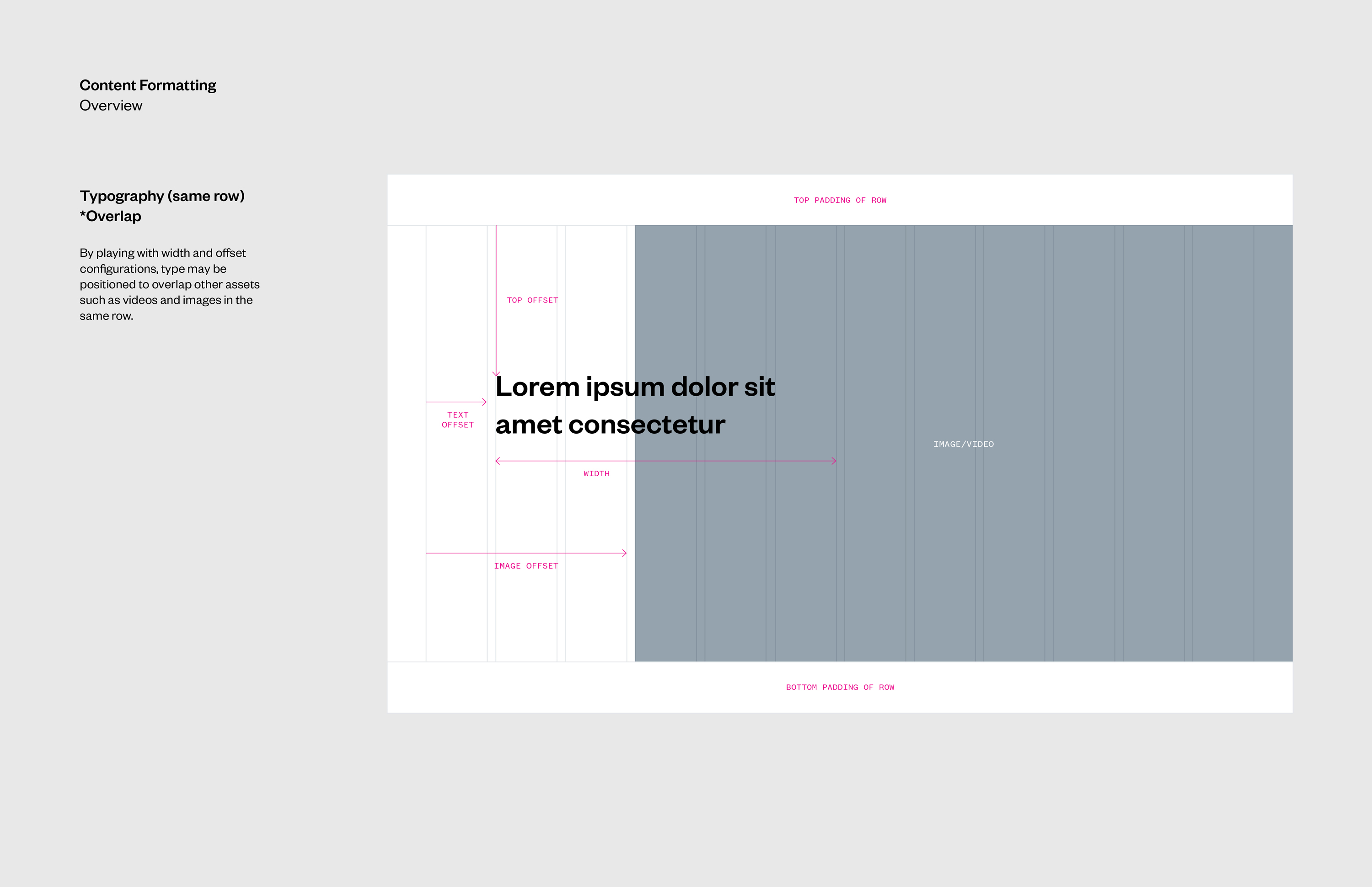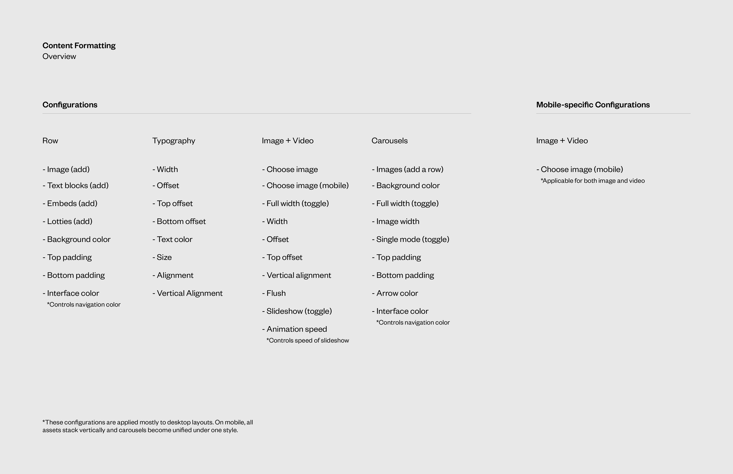 The new site allowed for lots of storytelling flexibility. Built on a grid offset system, we could control almost all aspects of the layout from the CMS by specifying the number of columns and padding units, which sizes and positions our assets accordingly. We also have the option to change the color of module backgrounds, typography, and even carousel styles from an inset “flow” sequence to cinematic full-bleed imagery.