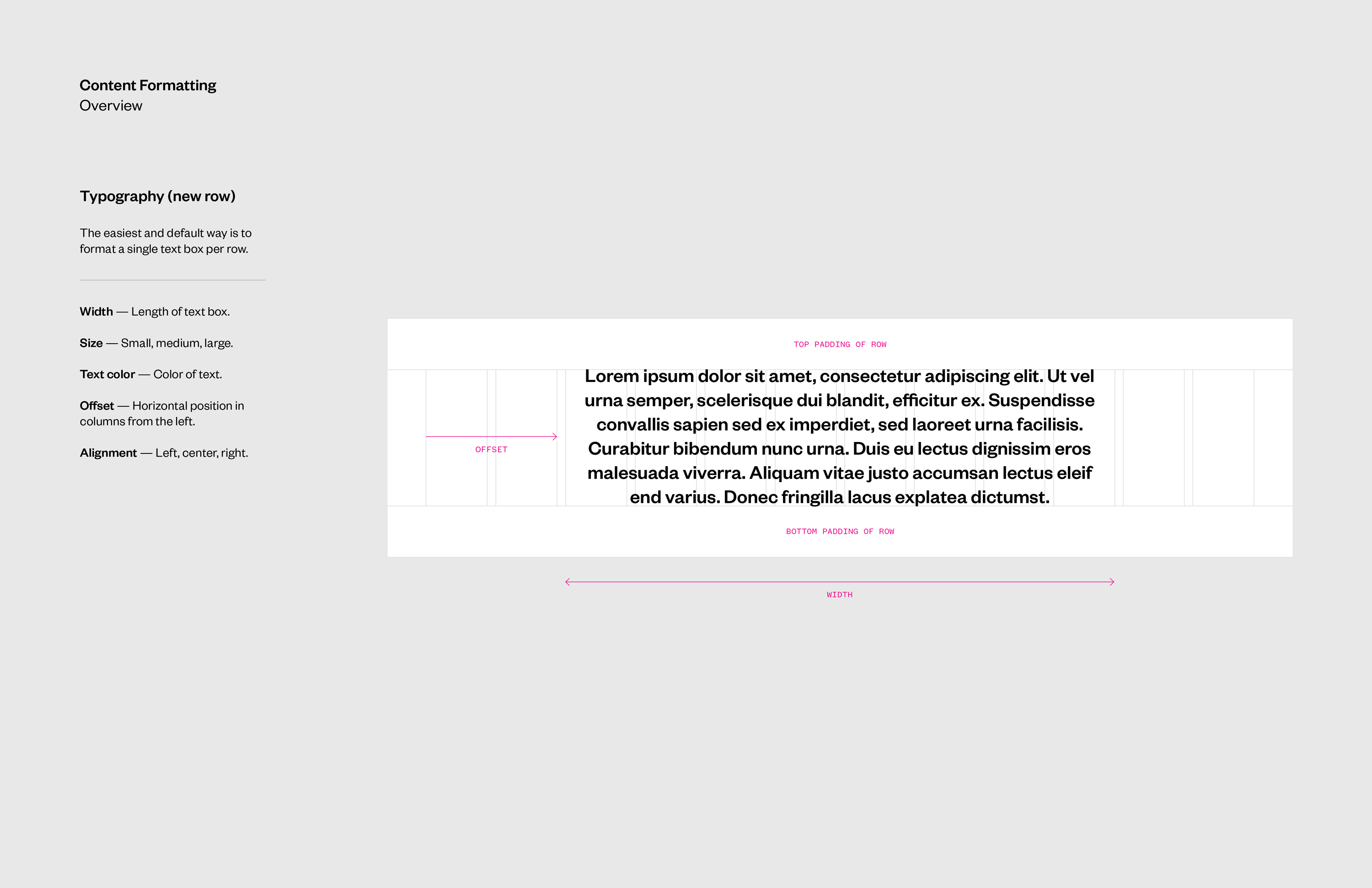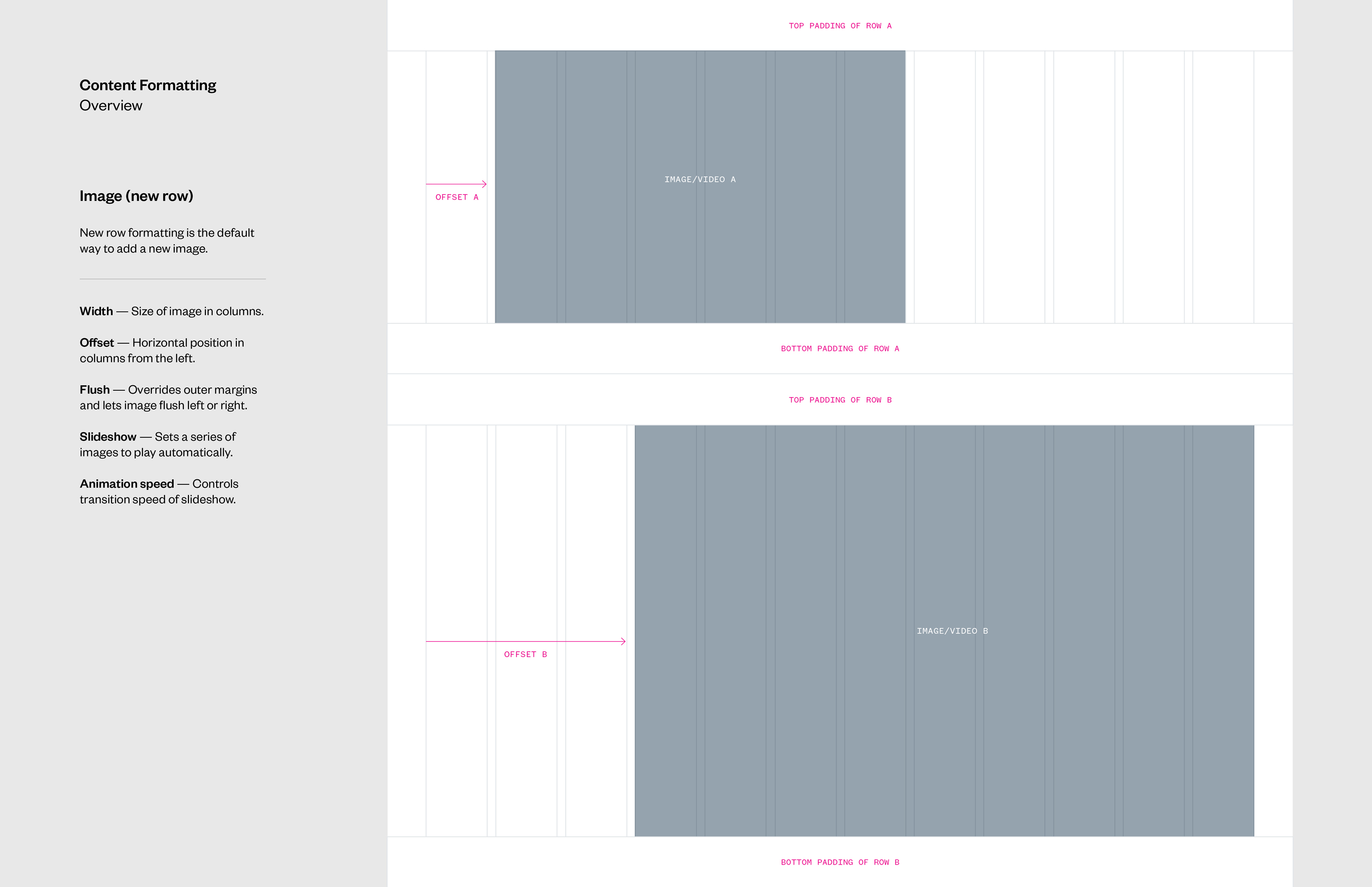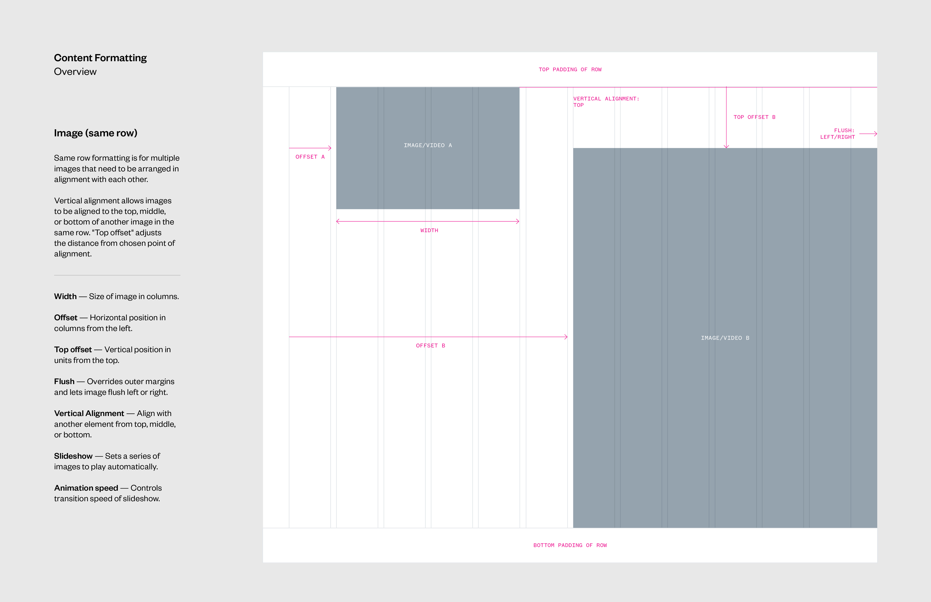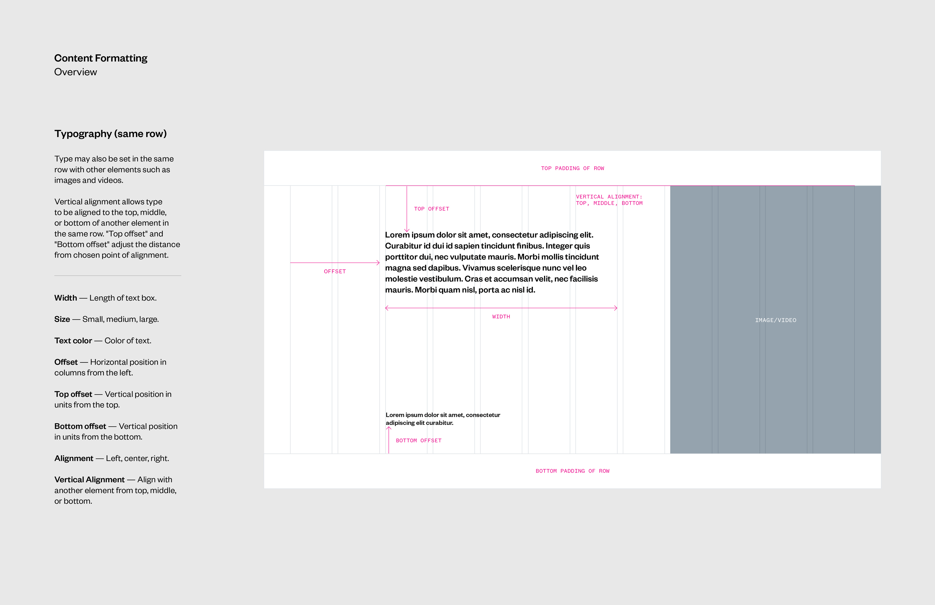 The new site allowed for lots of storytelling flexibility. Built on a grid offset system, we could control almost all aspects of the layout from the CMS by specifying the number of columns and padding units, which sizes and positions our assets accordingly. We also have the option to change the color of module backgrounds, typography, and even carousel styles from an inset “flow” sequence to cinematic full-bleed imagery.