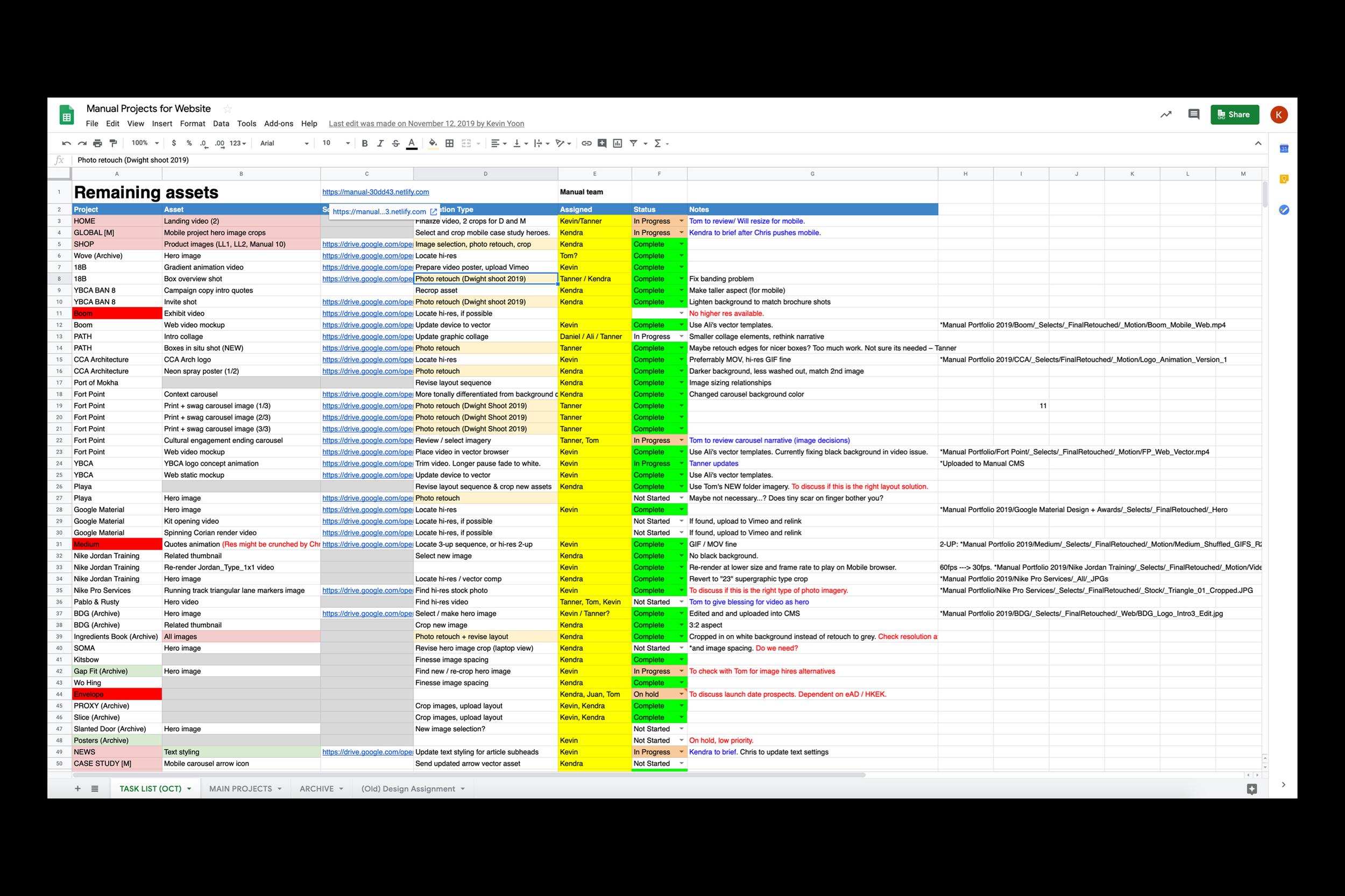 When preparing assets and design layouts for 16 case studies to be included in the initial 2019 launch, I created a spreadsheet to track progress and divide tasks among the Manual team.